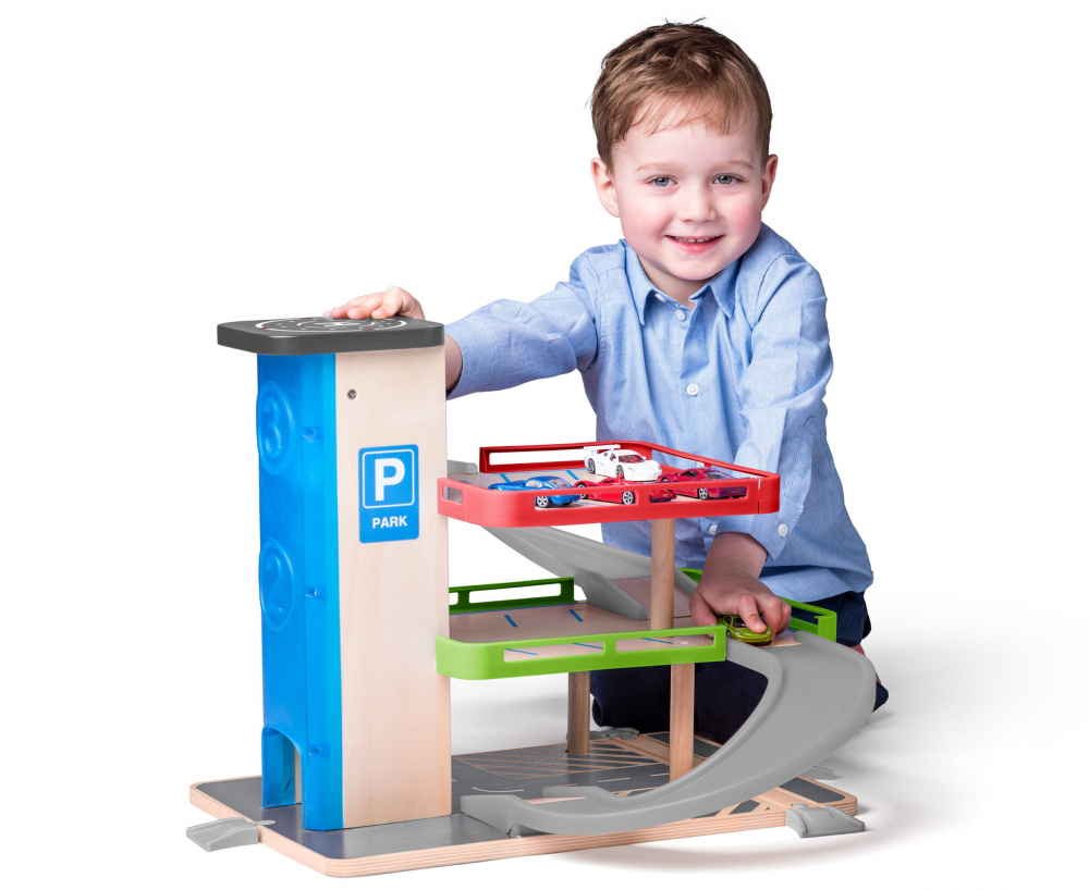 Un garaj din lemn cu un ascensor este foarte distractiv pentru micutii auto.