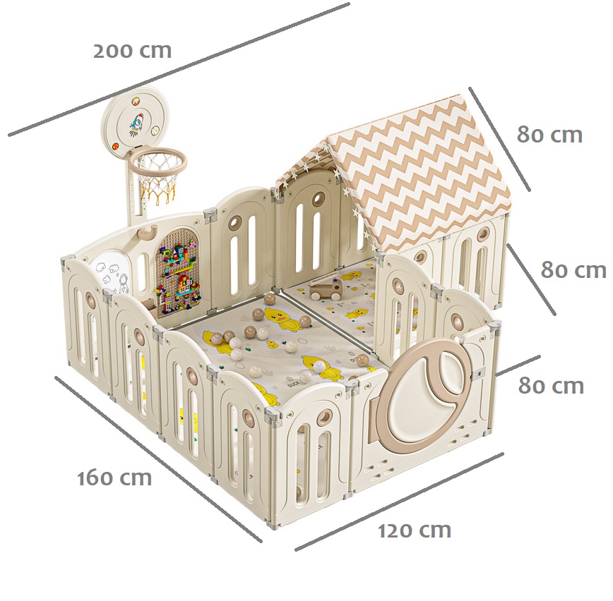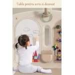 Gardulet loc de joaca copii Nichiduta Garden Happy Home cu poarta de siguranta, Cos de baschet, Unitate muzicala,covoras 1cm grosime, cuburi,tabla, instrumente pentru scris, 100 bile color si casuta