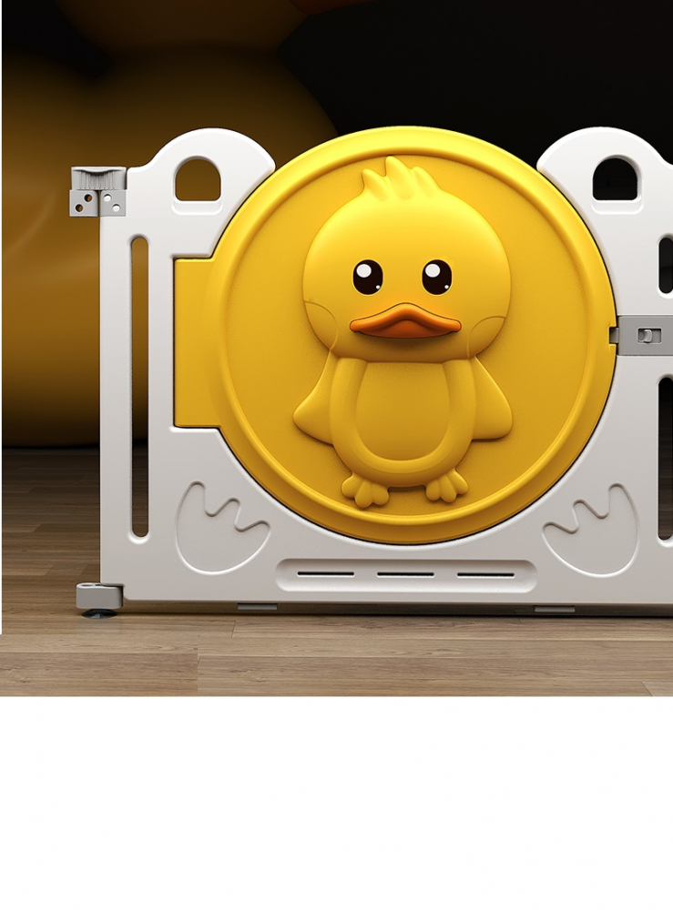 Gardulet loc de joaca Nichiduta Garden Duck Yellow 160X160cm, utilizare interior/exterior, cu organizator, casuta,poarta de siguranta,covoras spuma 1cm,cos de baschet,100bile color, lumini, jucarie muzicala, margini rotunjite