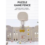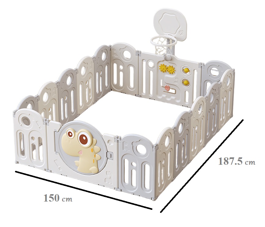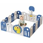 Gardulet loc de joaca pentru copii Nichiduta Garden Blue Dinosaur pliabil, portabil, de interior/exterior, compus din 14 panouri de gard + 2 panouri laterale, cos de baschet, usa cu blocare, inalt 61 cm