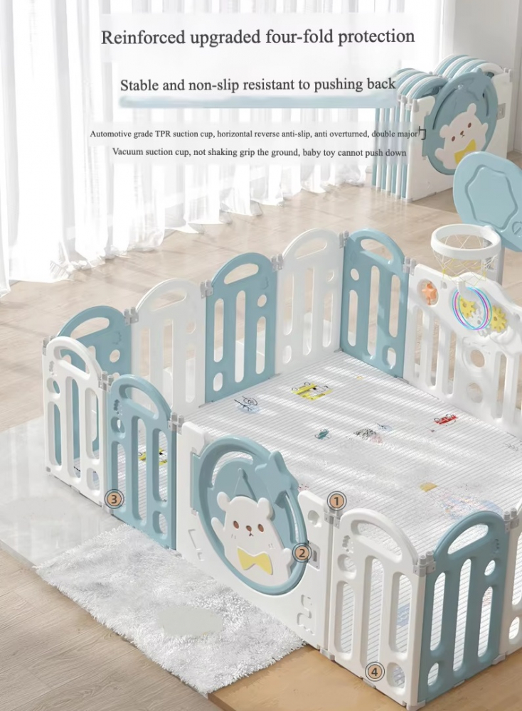 Gardulet loc de joaca pentru copii Nichiduta Garden White/Blue Bear, pliabil si portabil, de interior/exterior, compus din 14 panouri de gard + 2 panouri laterale cu Cos de baschet si angrenaje rotative