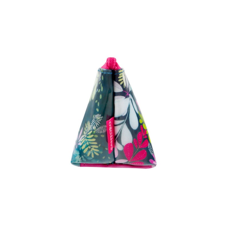 Partea din fata a gentutei are un fundal de culoare albastra si un decor cu doi simpatici lenesi atarnand de ramuri colorate. Simpaticele creaturi sunt desenate in nuante diferite. Pe cealalta parte, geanta prezinta frumoasa sigla Santoro inconjurata de un model repetitiv de frunze multicolore. Interiorul are o captusala de culoare verde, din poliester. Geanta se inchide cu un fermoar ce are o culoare vibranta de zmeura.