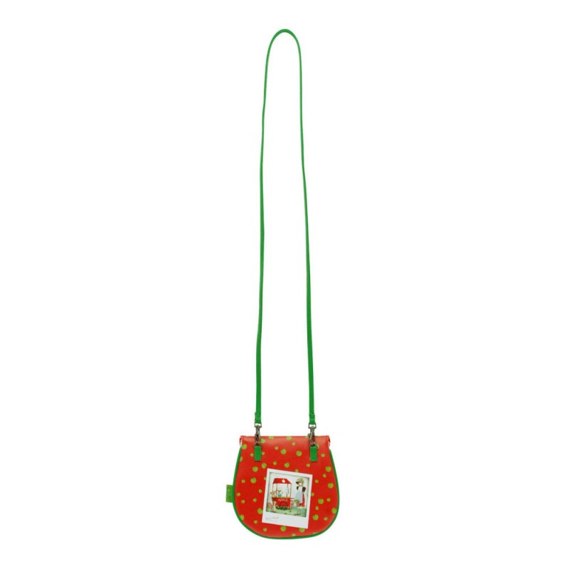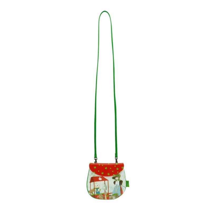 Geanta vine in nuante de rosu si verde, cu un imprimeu de mere verzi – iar creatia An Apple A Day de la Kori Kumi este frumos prezentata pe partea frontala.