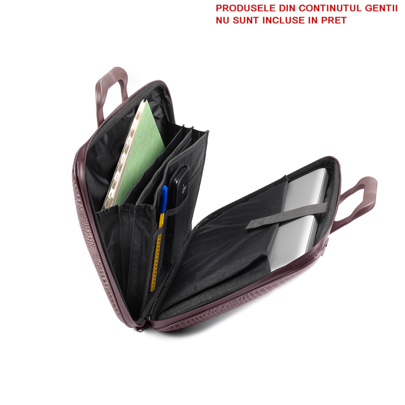 Aceasta geanta robusta, eleganta, pentru laptop este fabricata din piele ecologica, cu imprimeu croco luciors si manere din silicon. Geanta lux business laptop 15,6 Bombata Shiny Cocco-Grena nu este deloc plictisitoare ea este realizata din materiale solide intr-o nuanta deosebita de grena. Marginile elegante, cromate, dau acea nota de eleganta care o face remarcata.