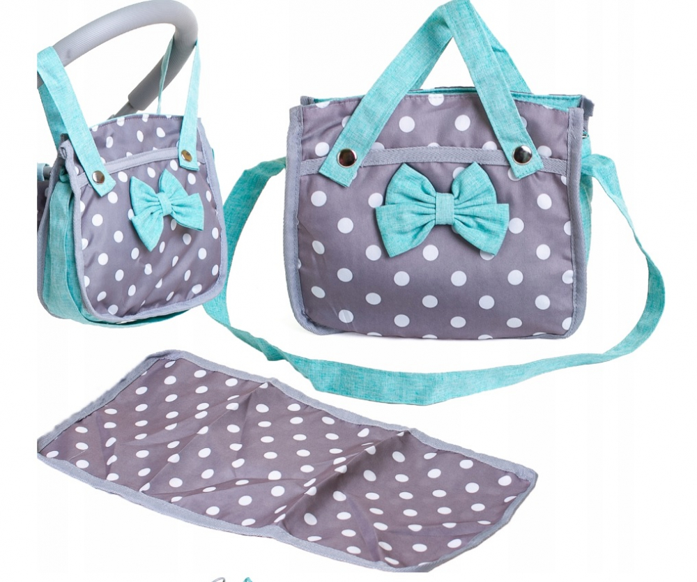 Geanta pentru carucior papusi cu salteluta de infasat Doris Turcoaz/Gri bulinute albe