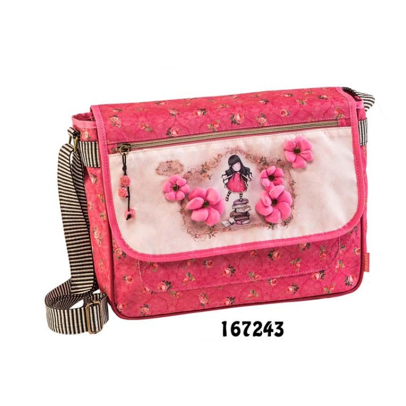 Gorjuss-Geanta scoala 33 cm New Heights este un accesoriu ideal pentru scoala, datorita formei dreptunghiulare a compartimentelor in care incape perfect orice carte sau caiet. Aceasta geanta are 2 compartimente mari, unul deschis si unul inchis printr-un fermoar in forma de inima in interiorul caruia se mai afla un buzunar micut pentru pastrarea obiectelor importante. Clapeta cu arici care securizeaza continutul gentii este dotata cu un buzunar cu fermoar, perfect pentru depozitarea lucrurilor la care este nevoie de acces rapid. Cureaua ajustabila faciliteaza transportul gentii pe umar si aduce un plus de stil acestui obiect. Designul gentii este placut, avand imprimat un model cu flori, iar pe partea din fata o simpatica fetita Gorjuss alaturi de cateva floricele prinse prin capse.