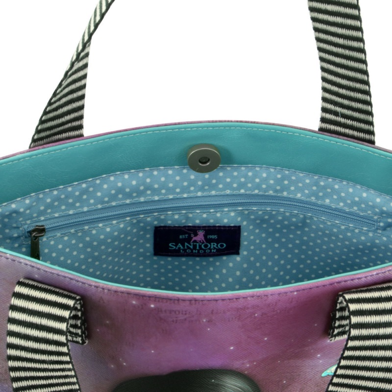 Geanta pentru shopping Gorjuss are un compartiment care se inchide cu capsa, barete de umar textile, foarte rezistente, un buzunar cu fermoar in interior si doua buzunare practice pentru chei sau depozitat lucruri marunte.