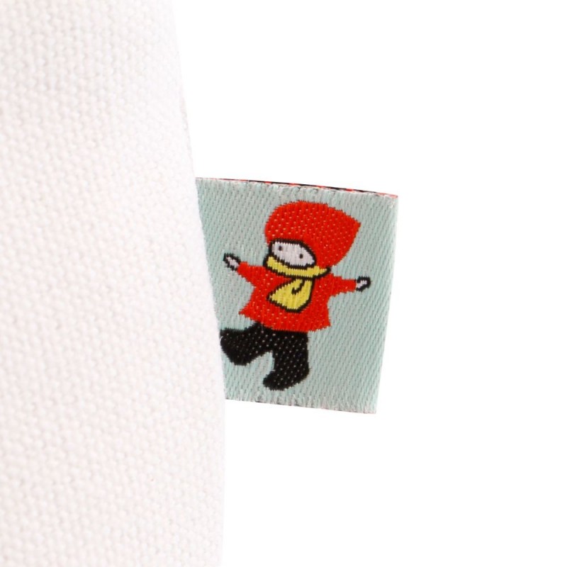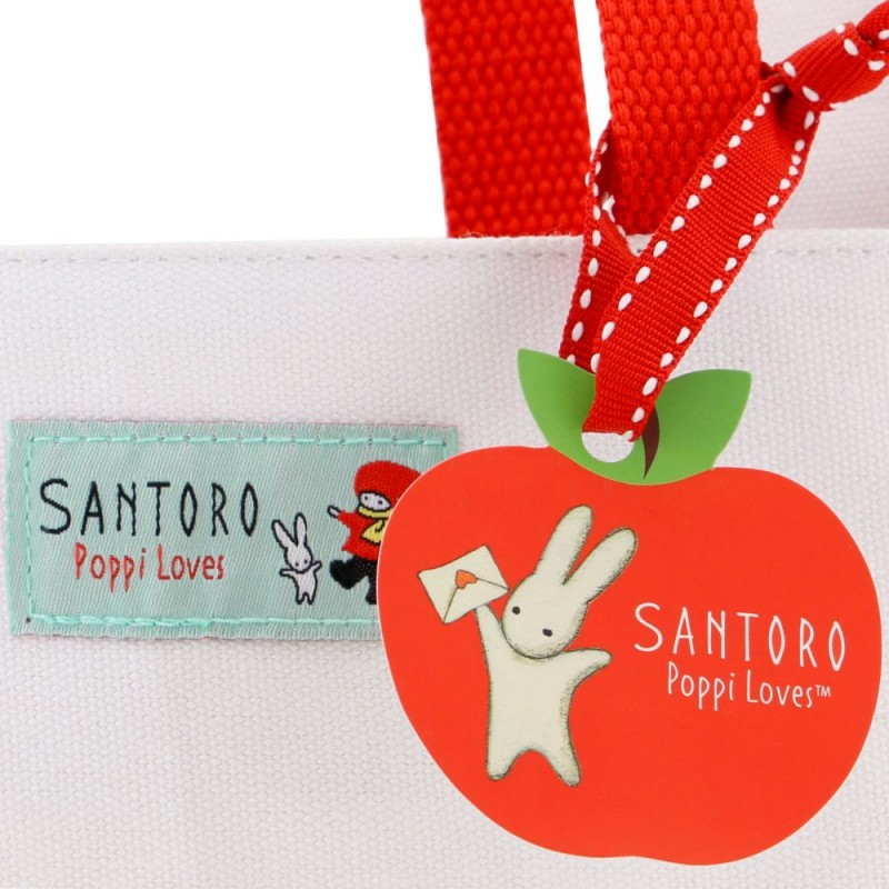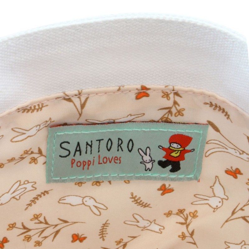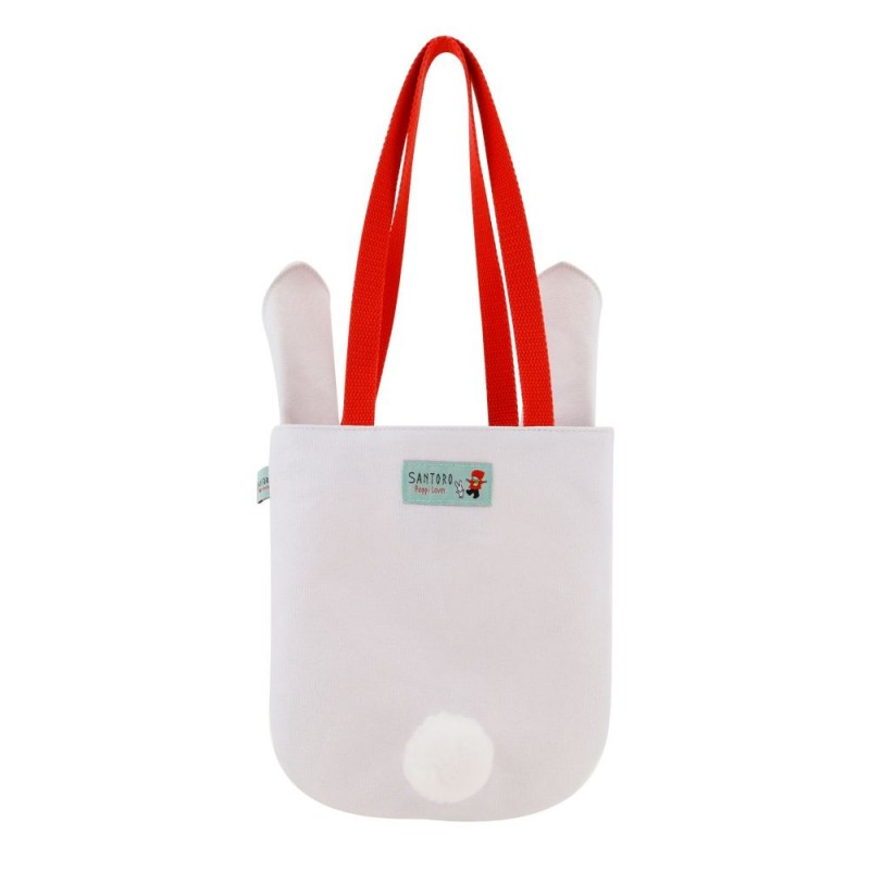 Gentuta Poppi Love de la Santoro este in forma de iepuras alb, iar cele doua barete sunt din material textil, rosu. Captuseala din interior este de culoare crem si imprimata cu personajele din colectia Poppi Love.