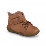 Confectionat din piele, inchidere cu siret elastic si velcro pentru o fixare mai usoara, cu captuseala din blanita pentru a mentine piciorusele calde.