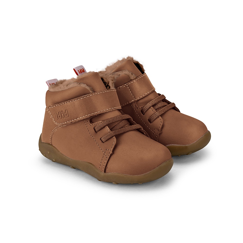 Confectionat din piele, inchidere cu siret elastic si velcro pentru o fixare mai usoara, cu captuseala din blanita pentru a mentine piciorusele calde.