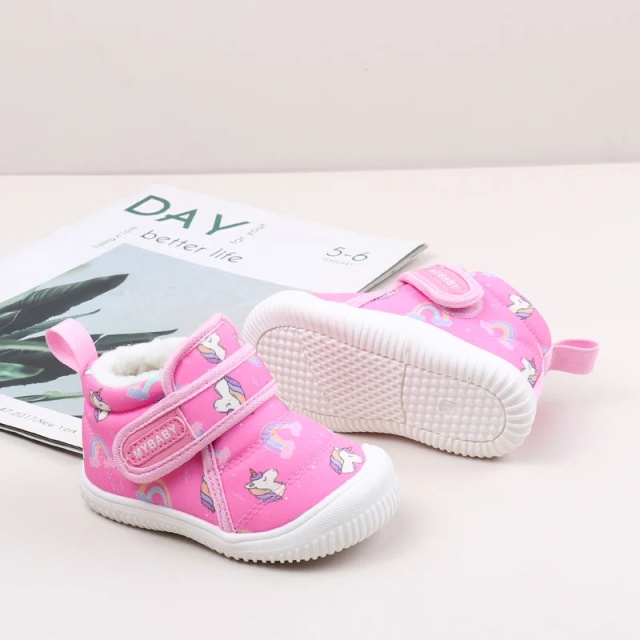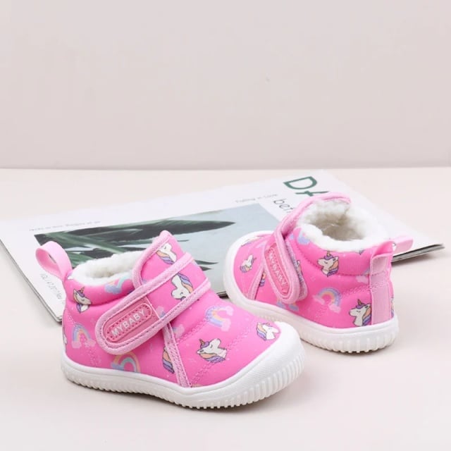 Ghete de iarna adorabile pentru copii, in nuanta roz, decorate cu imprimeu jucaus de unicorn si curcubee.
