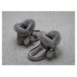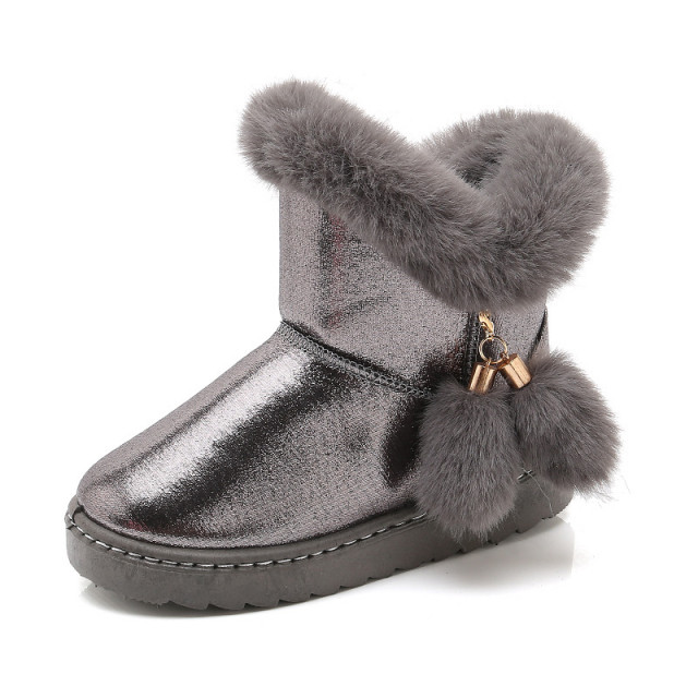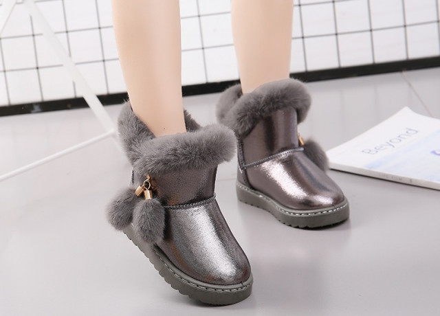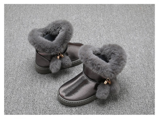 Ghete imblanite pentru fetite, din material tip piele ecologica, cu blanita aplicata pe margine si cu ciucurei intr-o parte.