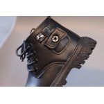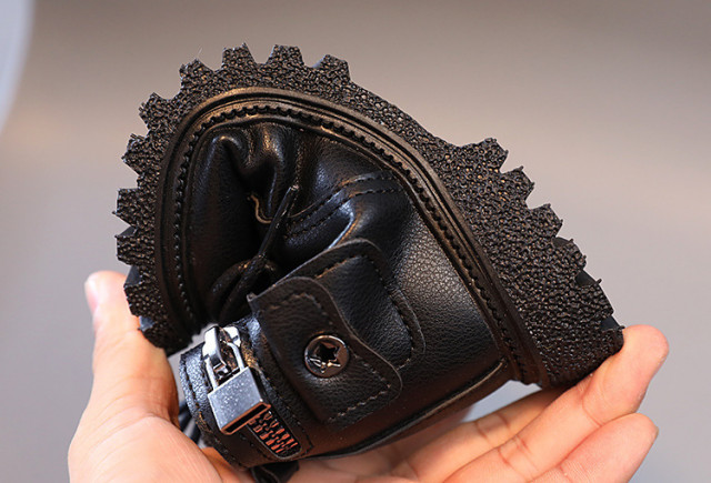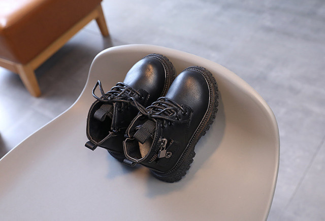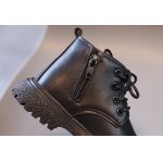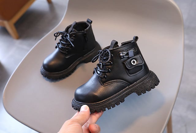 Ghete neimblanite pentru baietei, din material tip piele ecologica, cu un buzunarel aplicat, se inchid cu siret si cu fermoar intr-o parte.