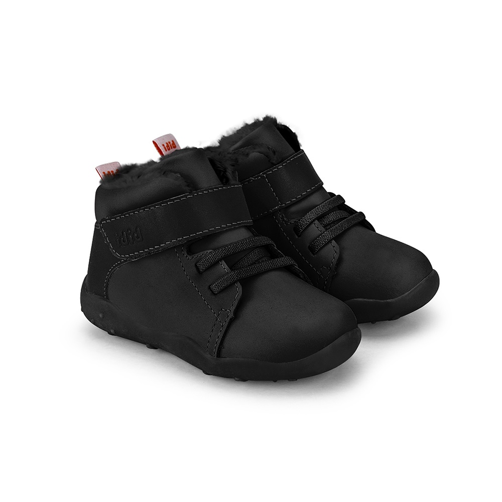 Confectionat din piele, inchidere cu siret elastic si velcro pentru o fixare mai usoara, cu captuseala din blanita pentru a mentine piciorusele calde.