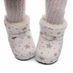 Ghetute pentru bebelusi, din material textil, imblanite, imprimate cu stelute gri.