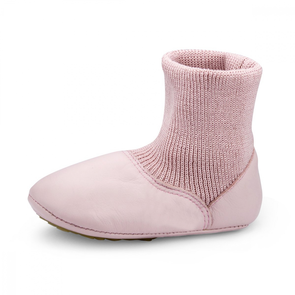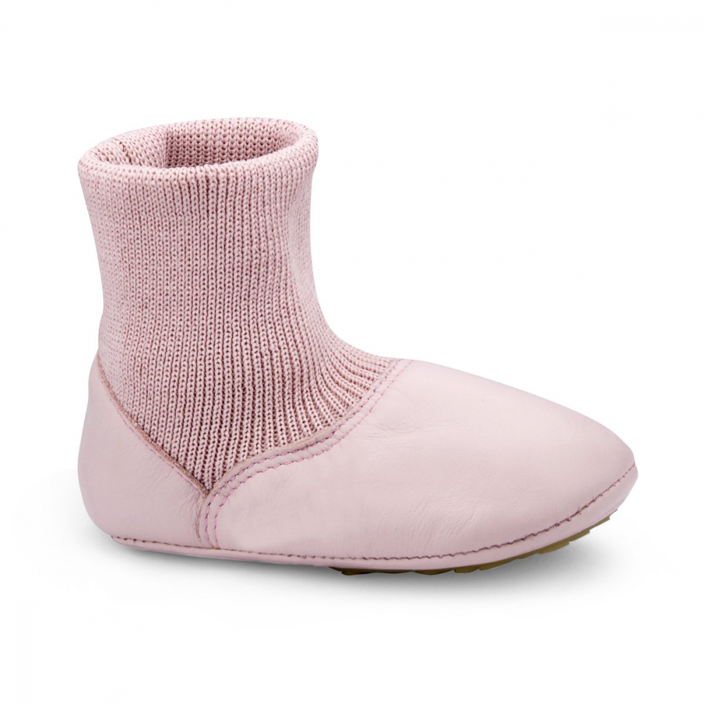 Ghetute unisex roz crosetate, cu exterior si brant de piele. Ideale pentru nou-nascuti.