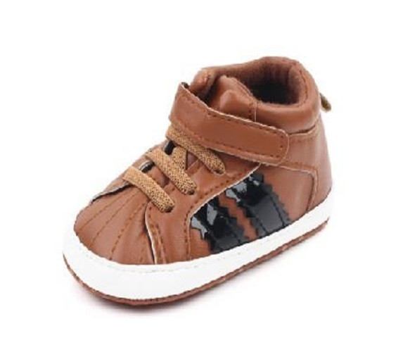 Ghetute inalte pentru bebelusi din material tip piele ecologica, prevazuti cu dungi laterale negre, se inchid cu sireturi din elastic si bareta cu arici intr-o parte.