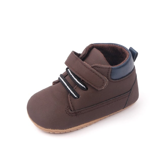 Designul modern cu inchidere velcro si sireturi decorative asigura o fixare sigura si usoara, in timp ce talpa moale antiderapanta ofera stabilitate la primii pasi.