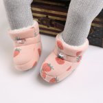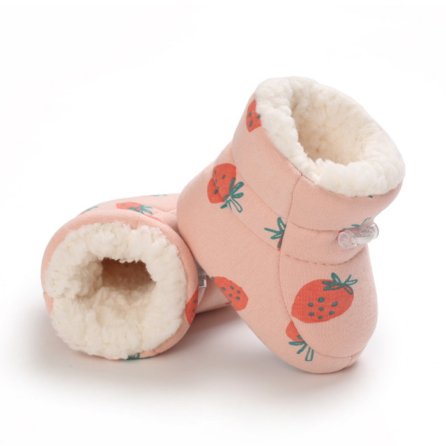 Ghetute pentru bebelusi, din material textil, imblanite, imprimate cu capsuni.