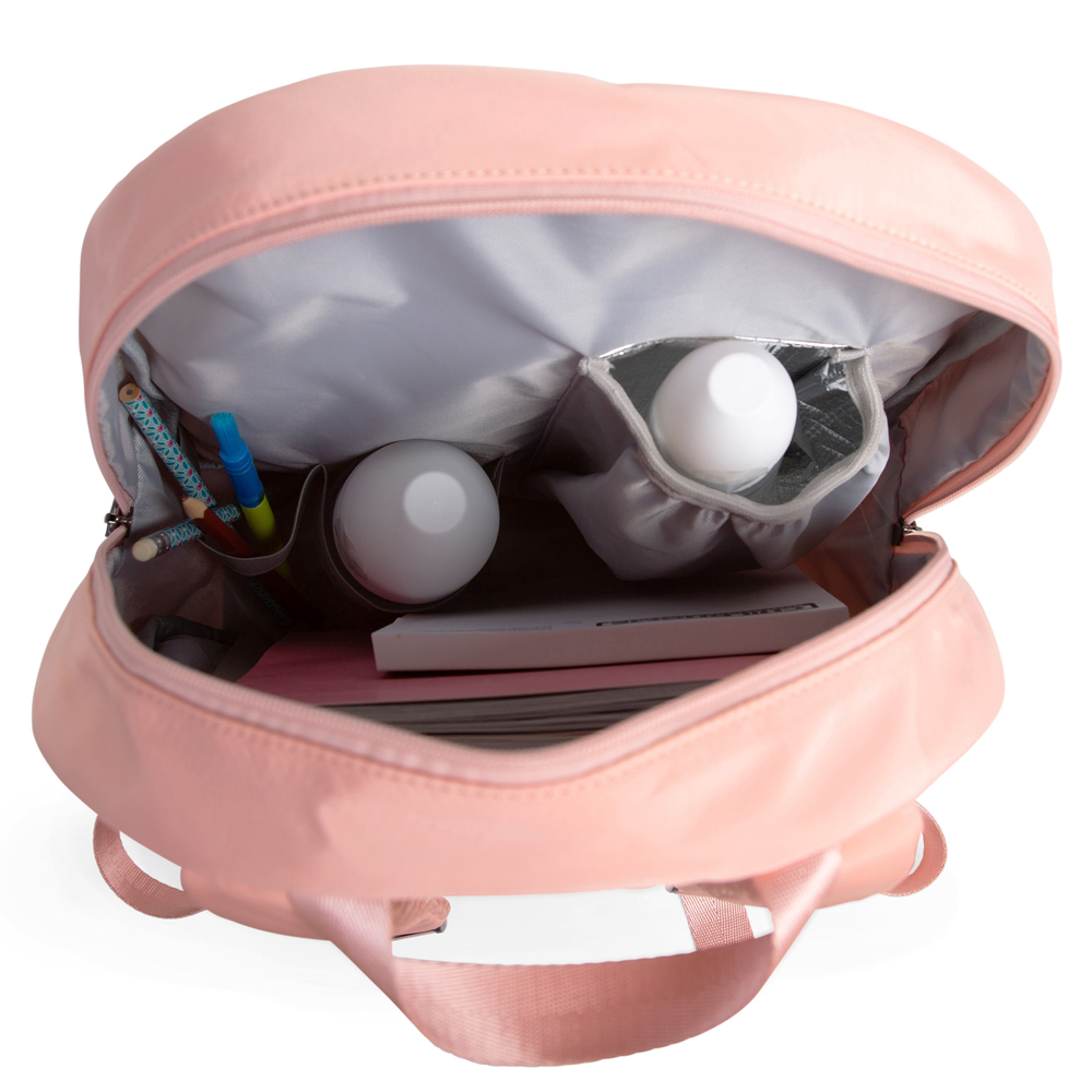 Compartimentul principal contine 2 spatii (unul potrivit pentru o tableta), 2 benzi elastice si un buzunar izolator pentru o sticla de baut.