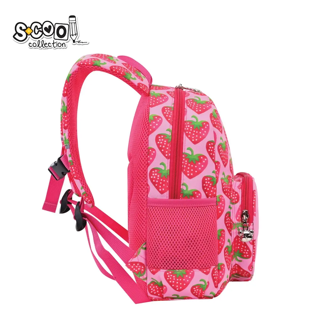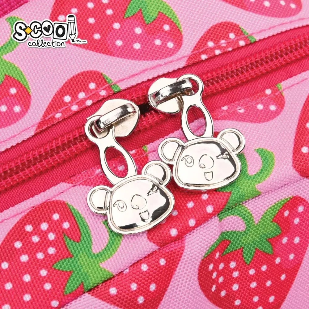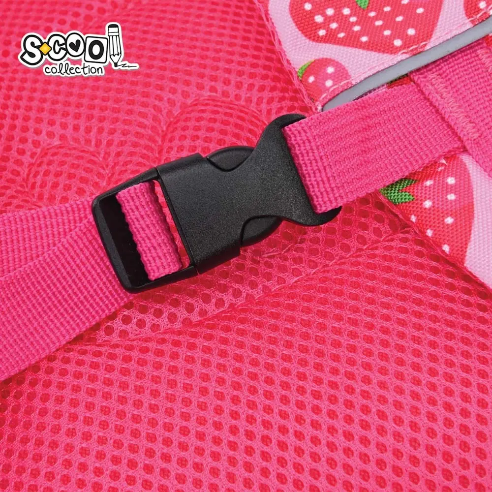 Ghiozdanul are un buzunar frontal cu forma de inimioară și imprimeu căpșună.