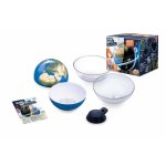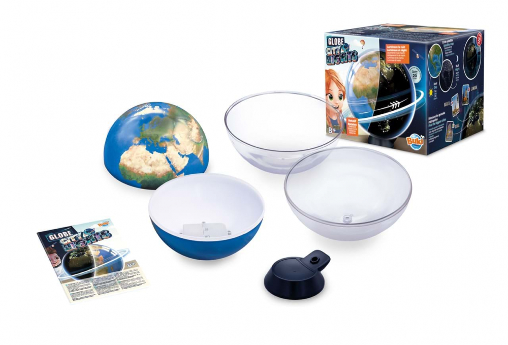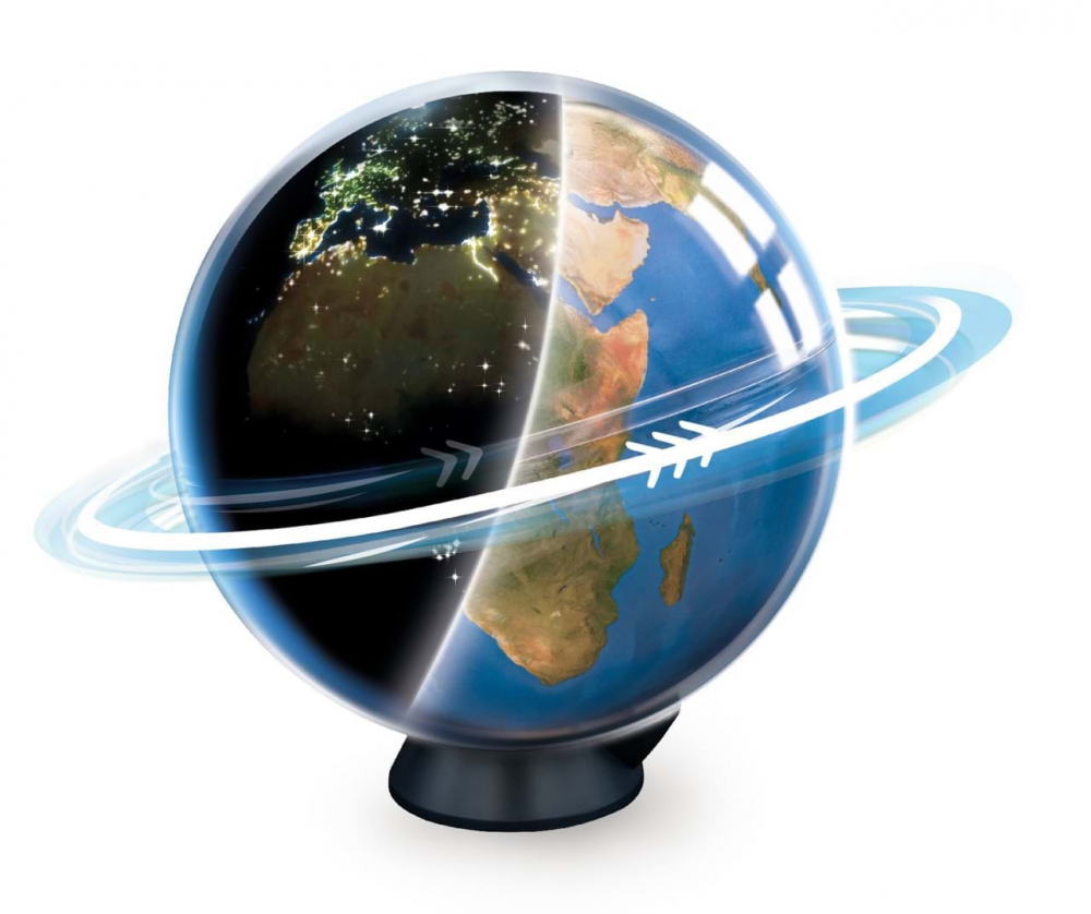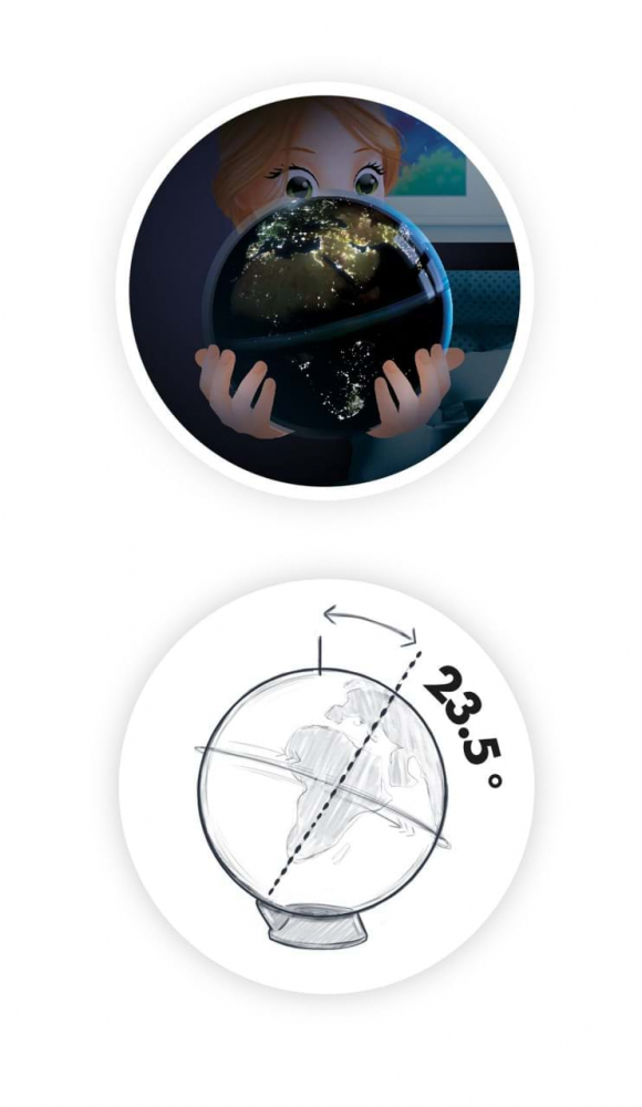 Pe timp de zi, descoperiti continentele si suprafata planetei cu ajutorul imaginii prin satelit a Pamantului. Noaptea, globul se lumineaza si cele mai mari orase ale lumii sunt iluminate asa cum se vad si din spatiu.
