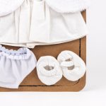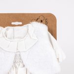 Ținută classy pentru păpușa ta: o rochiță albă sofisticată, combinată cu o jachetă pufoasă, chiloței și pantofiori asortați.