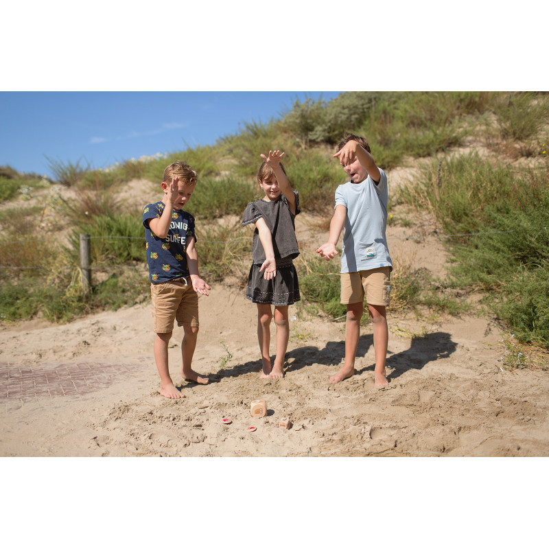 Dimensiuni: zar mare :7 x 7 x 7 cm; zar mic: 4 x 4 x 4 cm; jetoane: diametru: 4.5 cm