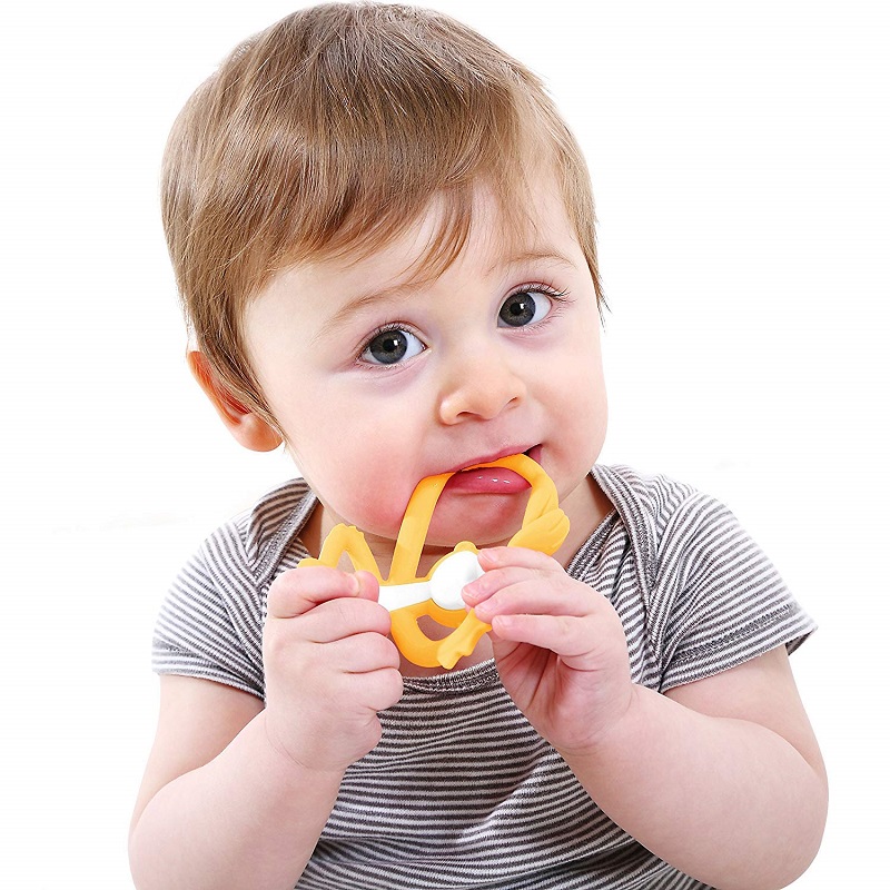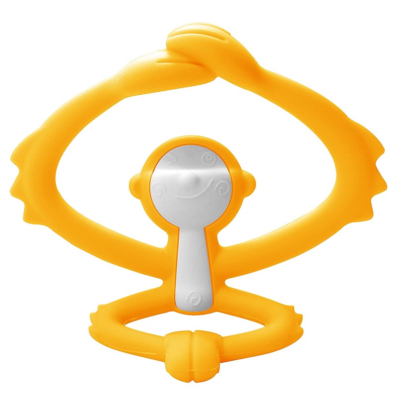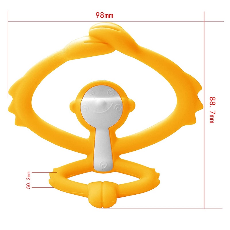 designul special de forma unei maimute haioase are o suprafata cu rizuri pentru masajul gingiilor bebelusului;