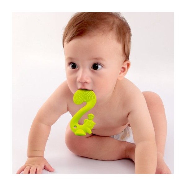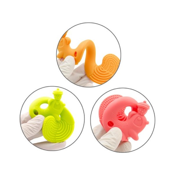designul special de forma unei veverite are o suprafata cu rizuri pentru masajul gingiilor bebelusului;