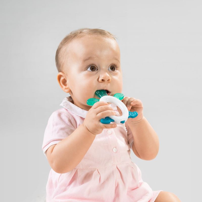 - Inel pentru dentitie cu tipuri diferite de suprafete pentru a oferi senzatii de calmare a durerii cat mai variate, prin racire sau masaj