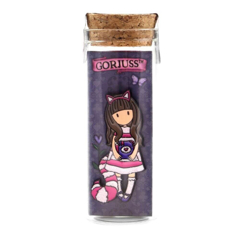 Insigna emailata Gorjuss Cheshire Cat vine intr-un mini borcan de sticla dragut, facandu-l cadoul perfect pentru o persoana draga.