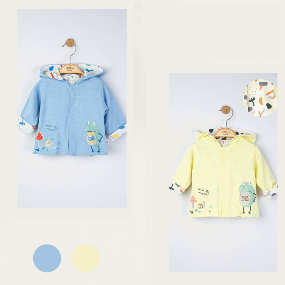 - este confectionata din bumbac, cu imprimeu atractiv cu broscute, melcisori si ciupercute