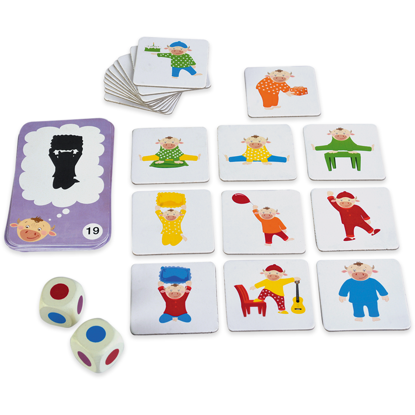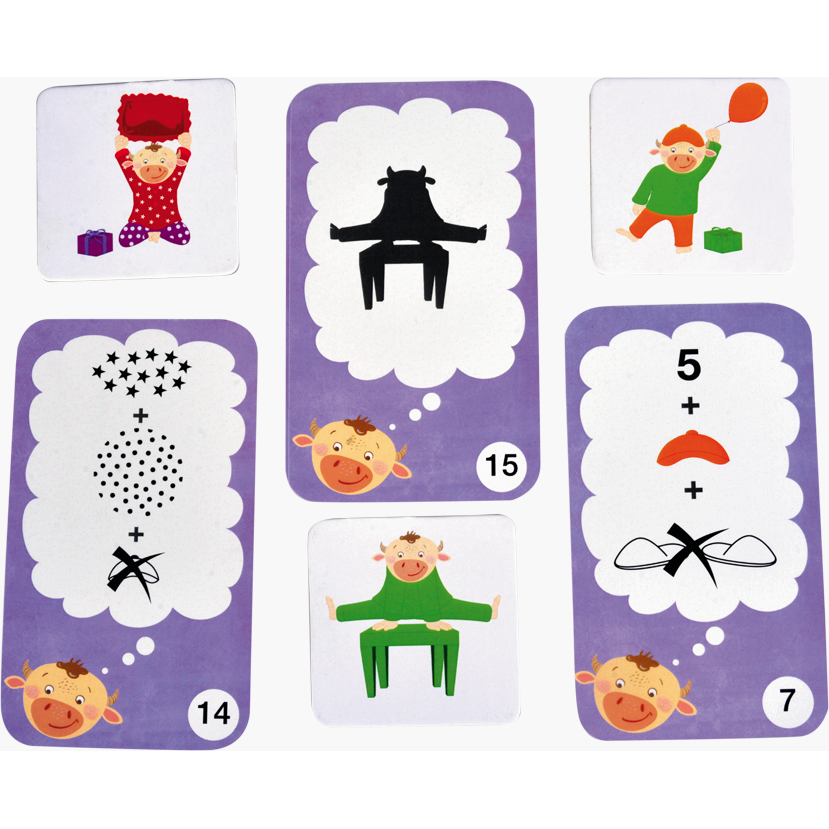Regulament: Cele 21 de jetoane cu prietenii lui Marvin sunt imprastiate cu fata in sus pe o suprafata dreapta. Jucatorul care striga cel mai tare “Moo” incepe primul jocul. El trebuie sa dea cu ambele zaruri. Toti jucatorii incep sa caute cardul cu vacuta imbracata in combinatia de culori indicata de zaruri. Primul jucator care atinge jetonul cu vacuta respectiva il castiga. Jocul se incheie cand jetonele se termina. Jucatorul cu cele mai multe jetoane cu vacute este castigator. A doua varianta de joc presupune sa gasesti primul vacuta, bazandu-te pe caracteristicile si cerintele indicate de cardurile cu probleme de logica. Cele 21 de jetoane cu prietenii vacutei Marvin Moo sunt imprastiate cu fata in sus pe o suprafata dreapta. Amesteca cardurile cu probleme de logica si aseaza-le teanc cu fata in jos. Jucatorul care striga cel mai tare “Moo “ incepe jocul si trage un card cu o problema de logica din teanc. Toti jucatorii incep sa caute jetonul cu vacuta care are caracteristicile indicate de card. Spre exemplu, daca pe card vei gasi o stea si cifra 6, trebuie sa cauti un jeton cu 6 obiecte si o vacuta care este imbracata intr-o pijama cu stea. Primul jucator care atinge jetonul corespunzator il ia si il arata celorlalti. Daca alegerea este corecta, jucatorul pastreaza cardul cu problema de logica si pune la loc jetonul. Jocul ia sfarsit cand toate problemele de logica au fost rezolvate. Jucatorul care a strans cele mai multe carduri castiga.