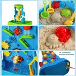 Elemente precum cupa de excavator, lopetile, galeata, strecuratoarea si barca incurajeaza miscarile precise si coordonarea ochi-mana.