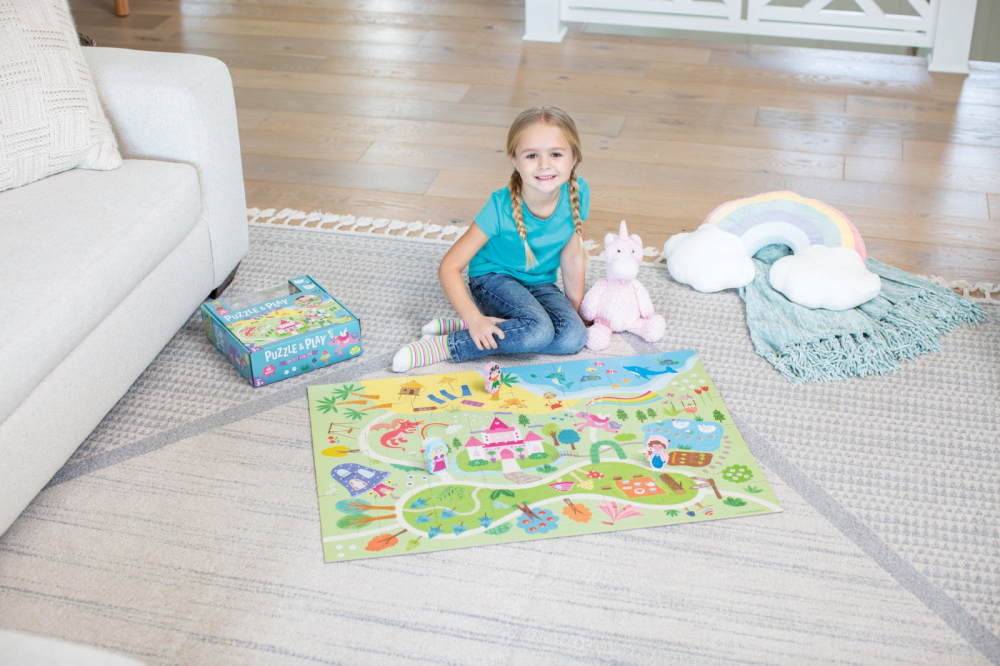 Un super joc 2 in 1! Copiii asambleaza mai intai puzzle-ul si descopera taramul de basm, apoi cu ajutorul celor 3 figurine prietene - printesa, zana si sirena isi creeaza propriile povesti!