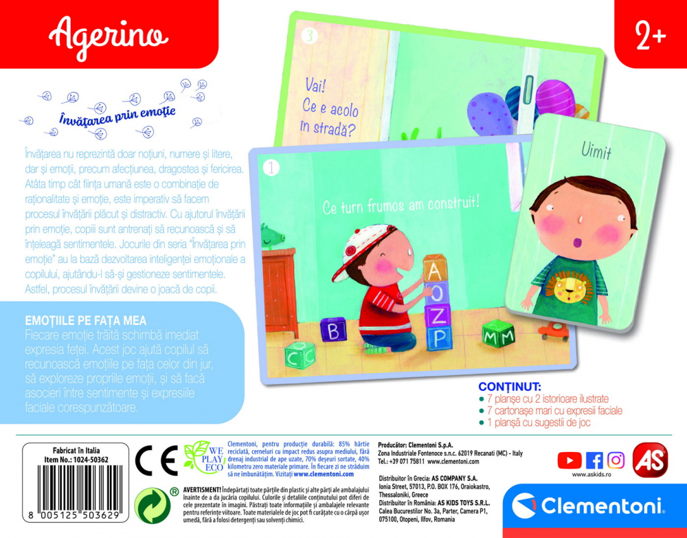Jocul contine 7 planse mari de carton cu 2 istoriare ilustrate, 7 cartonase cu expresii faciale, 1 manual de instructiuni si 1 oglinjoara.