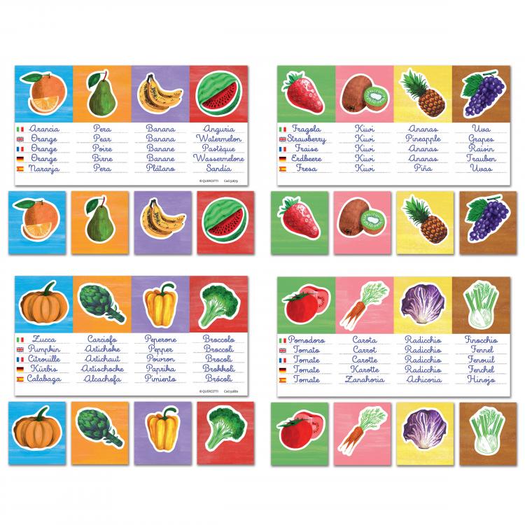 Doua planse colorate mari arata imagini cu fructe si legume, impreuna cu denumirile lor in cele 5 limbi.