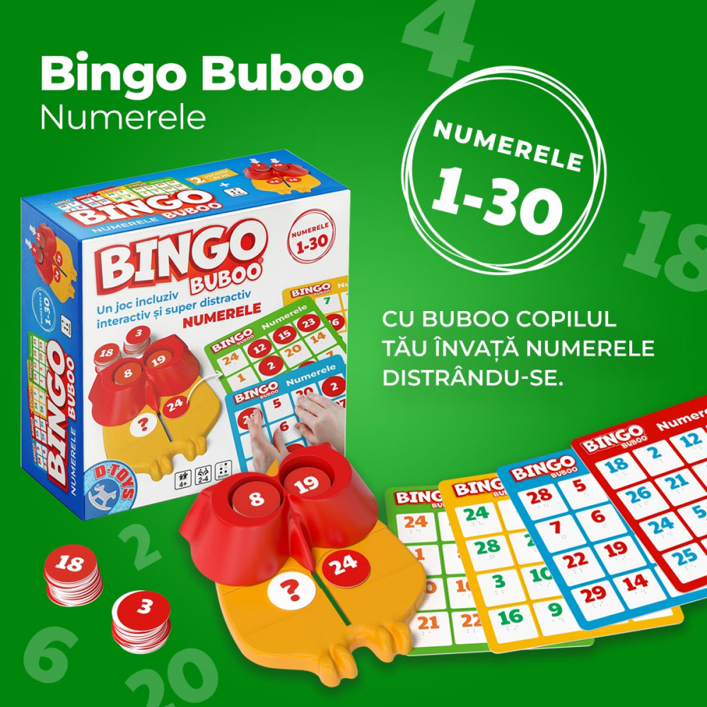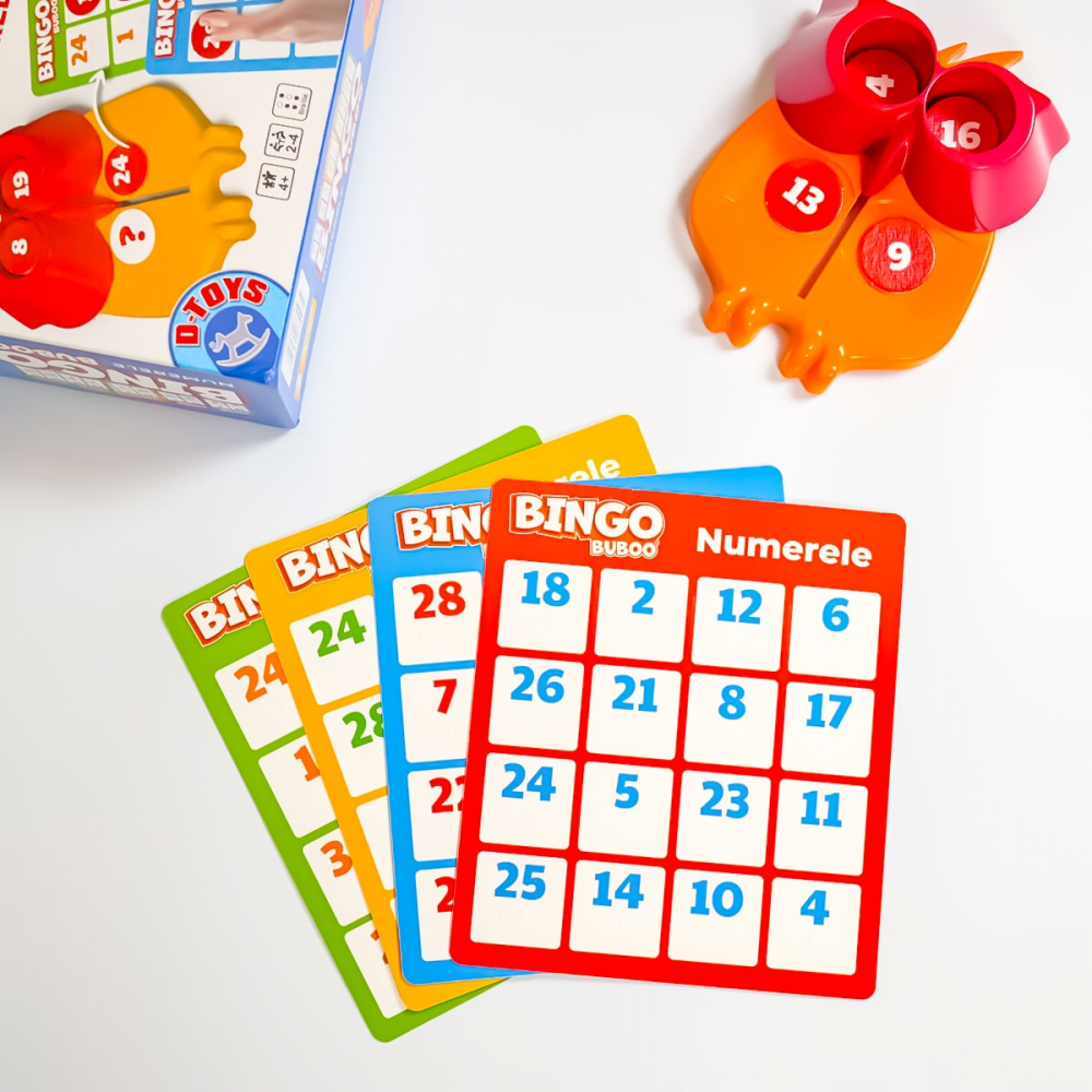 Jocul Bingo Buboo îi ajută pe cei mici să își dezvolte gândirea logico-matematică și agilitatea în încercarea de a-și completa rapid cu numerele potrivite cartonașele Buboo.