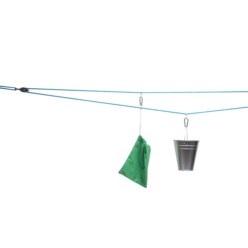 Setati-va telecabina! Cat de tare este!?! Legati franghia cu scripetele pe ambele parti si trageti de franghie pentru a pune galeata si geanta in miscare. Trimiteti-va reciproc note sau mici surprize. Jucaria ideala pentru a te juca ore intregi.