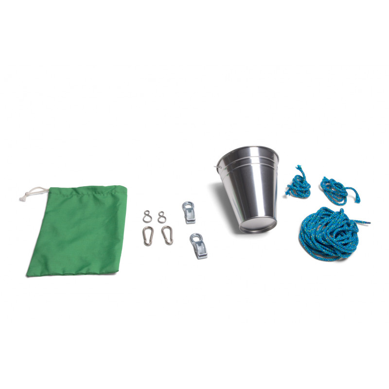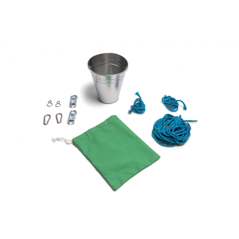 Setul contine: 2 scripeti, 2 carabiniere, 2 inele mici in forma cifrei 8, 2 franghii scurte (75 cm), 1 franghie lunga (6 m), 1 galetusa (13 x 11.5 x 6.5 cm), 1 saculet textil (20 x 14 cm)