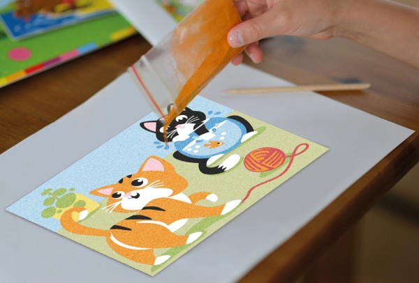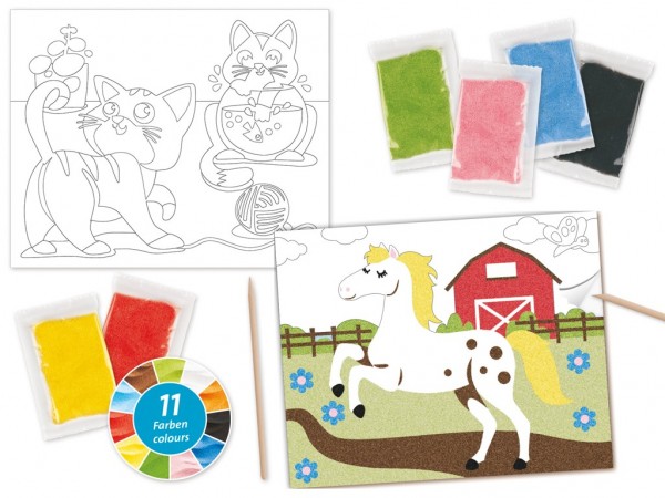 Joc creativ desen cu nisip 2 planse si 11 culori Calut si Pisici.