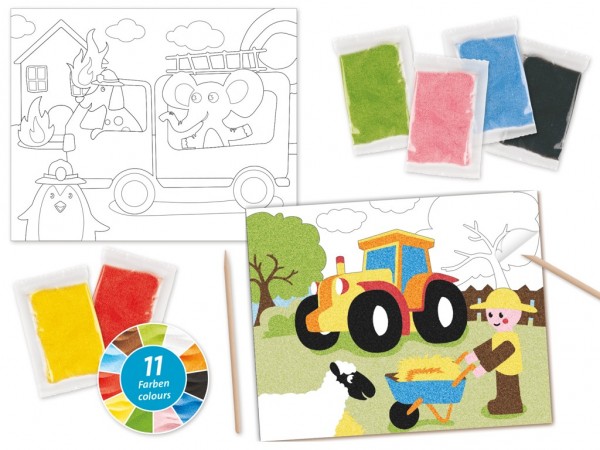 Joc creativ desen cu nisip 2 planse si 11 culori Vehicule cu animale