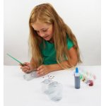 Pentru a evita orice accidente nedorite, vazele sunt confectionate din plastic. Instructiunile oferite au si cateva exemple de modele care se pot realiza pe sticlute.De asemenea, culorile si conturul negru special poate fi folosit si pe alte modele din sticla sau plastic, fiind rezistente la apa si puteti crea si alte modele deosebite folosind vesela de acasa farfurii, cesti, cani, boluri .