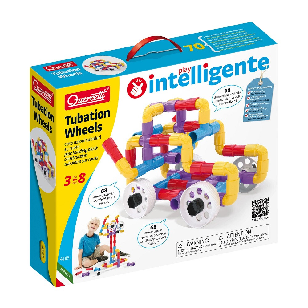 O jucarie devine mult mai interesanta atunci cand are roti! Noul joc de constructie Quercetti Tubation Wheels ii va cucerii pe copii. Piesele tubulare se imbina cu usurinta in nenumarate moduri, iar constructiile realizate se transforma in minunate masinute gratie celor 4 roti incluse in joc. Jocul include 4 tipuri de tuburi care ii permit celui mic sa construiasca diverse masini, roboti, statii spatiale. Piesele sunt realizate din material plastic de inalta calitate si au un design deosebit, astfel ca jocul va asigura garantat ore de joaca pentru cel mic.