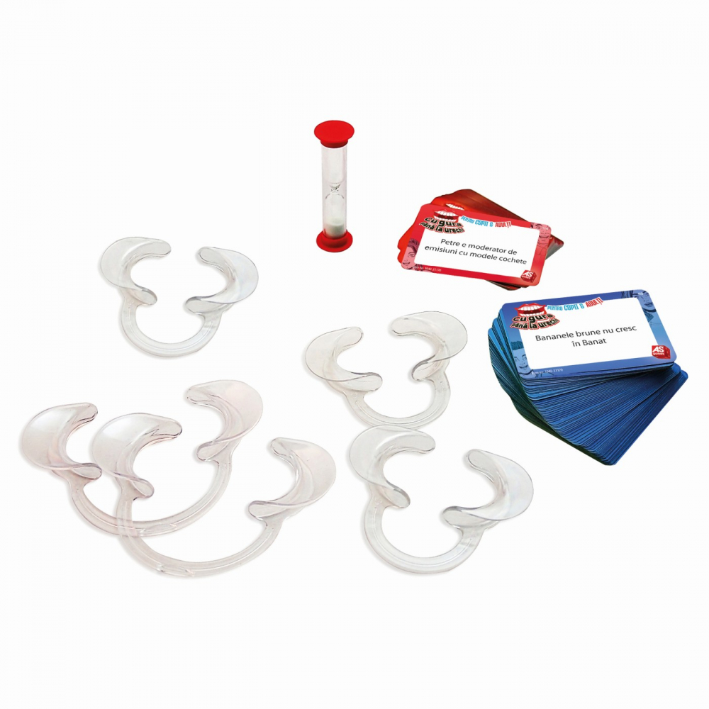 Setul contine 5 piese bucale (3 pentru adulti si 2 pentru copii), un cronometru si 100 de cartonase fata verso cu 200 de fraze hilare.