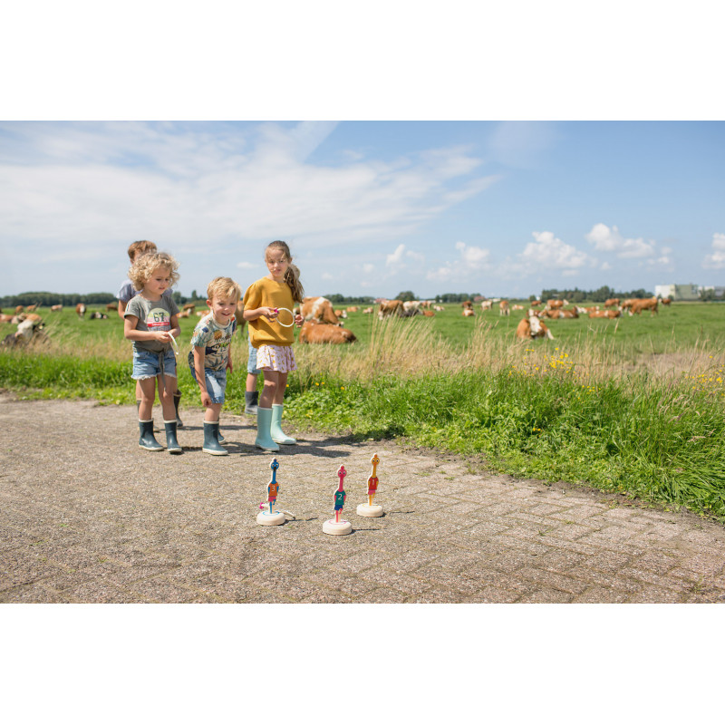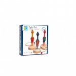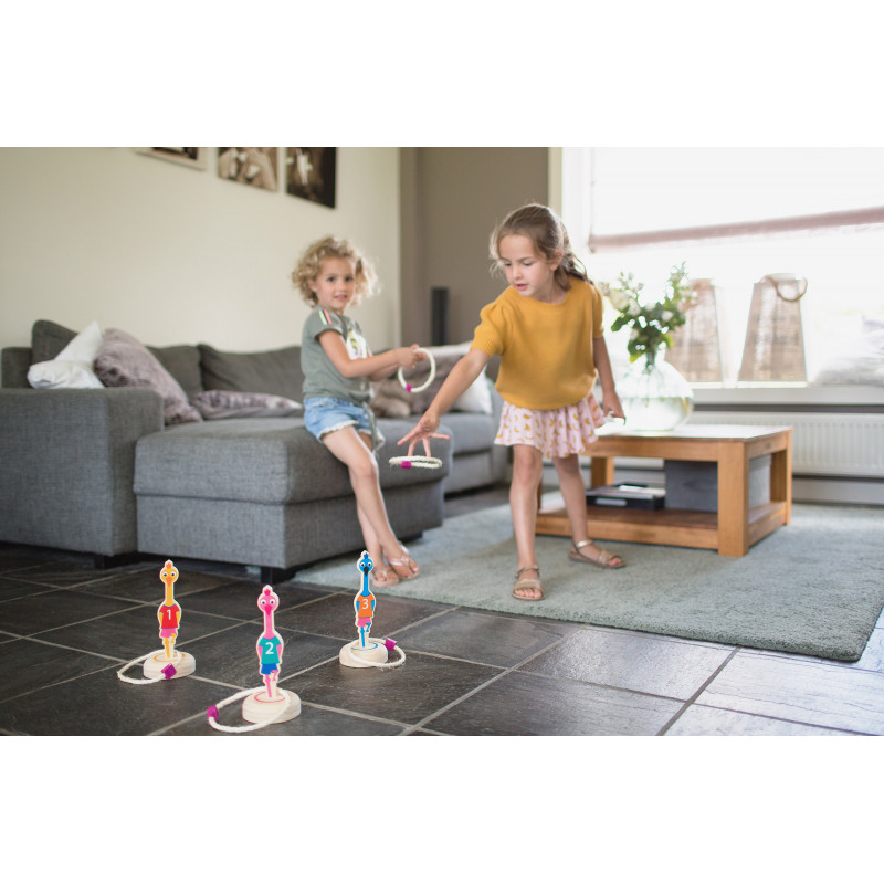 Jocul contine: trei pasari din lemn, trei suporturi din lemn pe care se fixeaza pasarile si trei inele din sfoara.