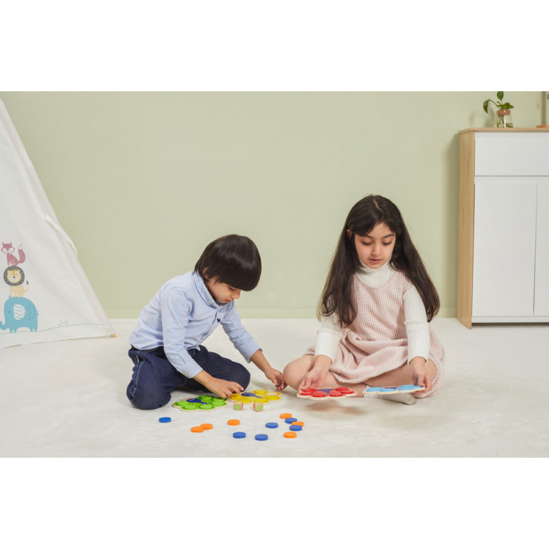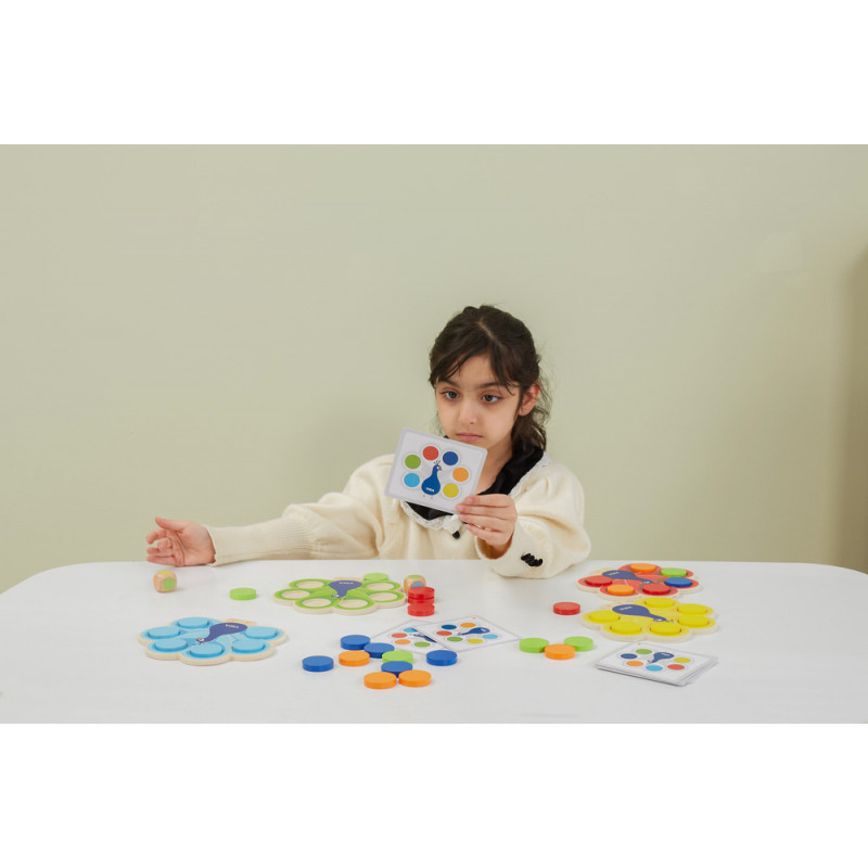 Punand jetoanele de culoare corespunzatoare pe tabla paun, conform cartii de joc, testeaza capacitatea copiilor de a citi imagini si de a identifica culorile.