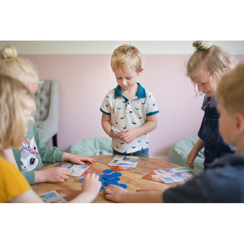 Jocul contine: 6 modele de casa din carton, 36 de jetoane, 1 saculet pentru jetoane