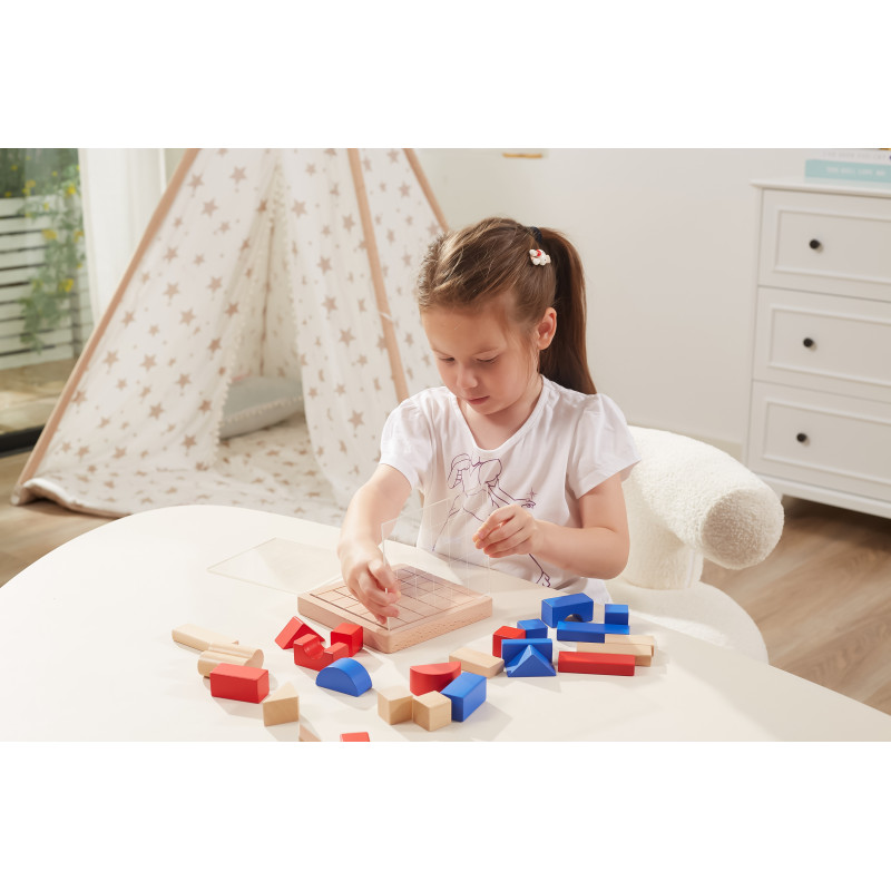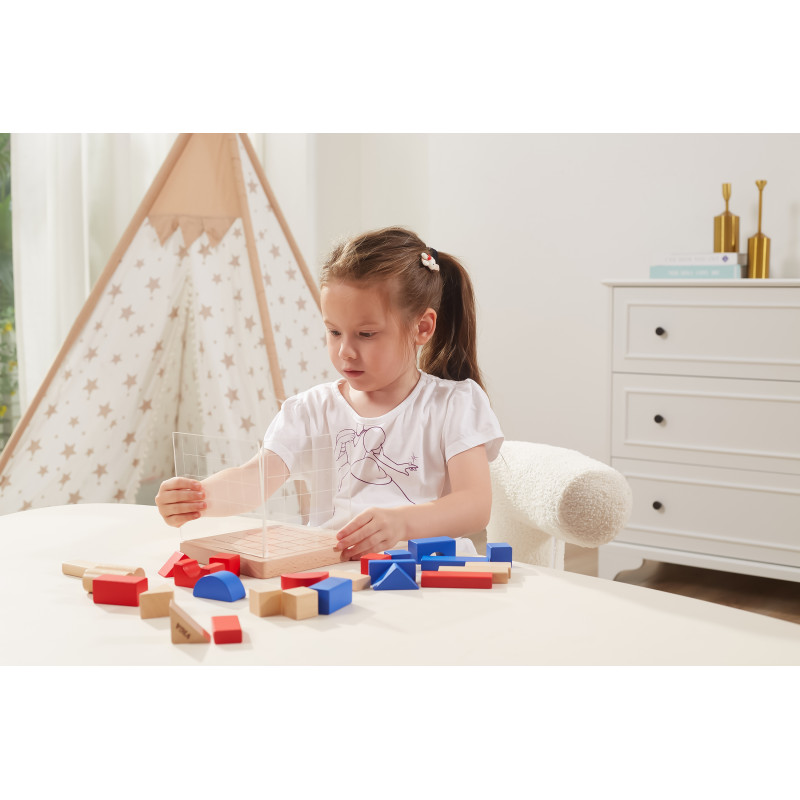 Acest joc de construire cu blocuri din lemn ii provoaca pe cei mici sa-si foloseasca abilitatile de gandire spatiala pentru a construi formatiuni de blocuri conform ghidului, dintr-o perspectiva 3D, oferind ore de invatare prin joaca.